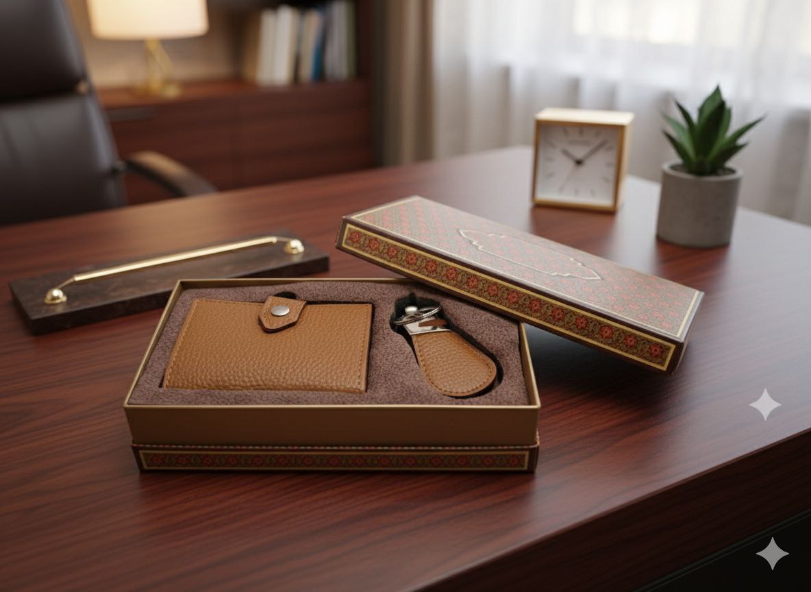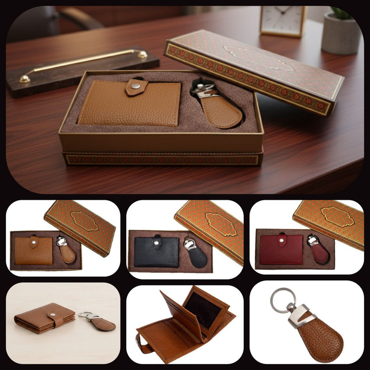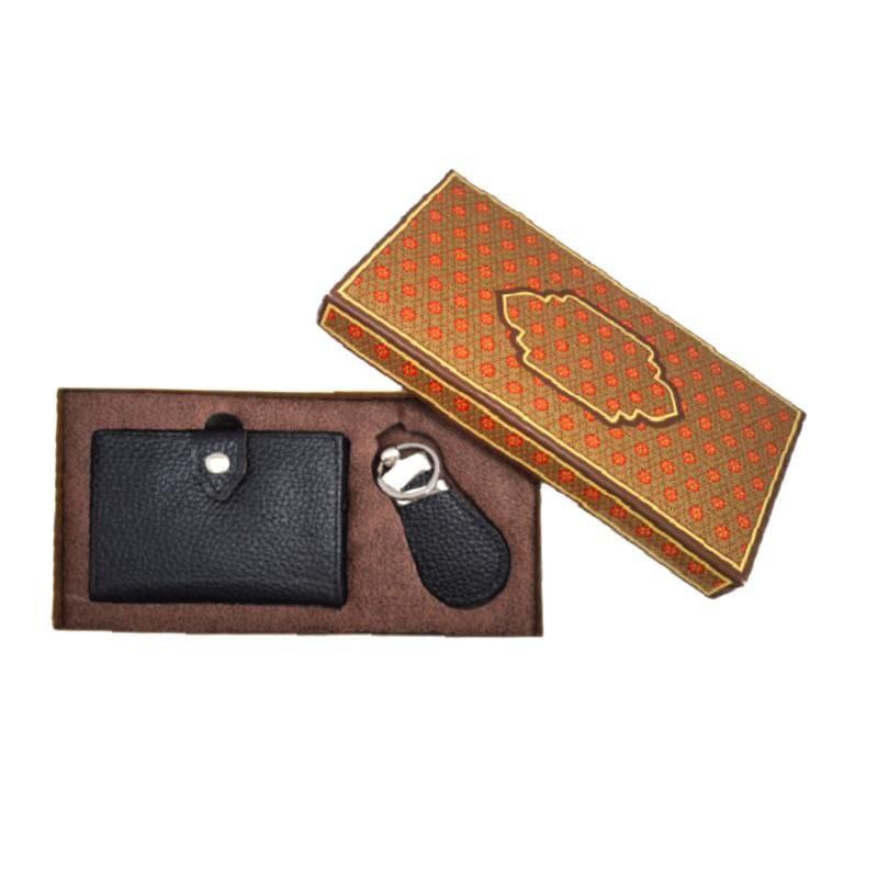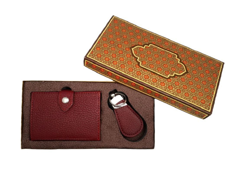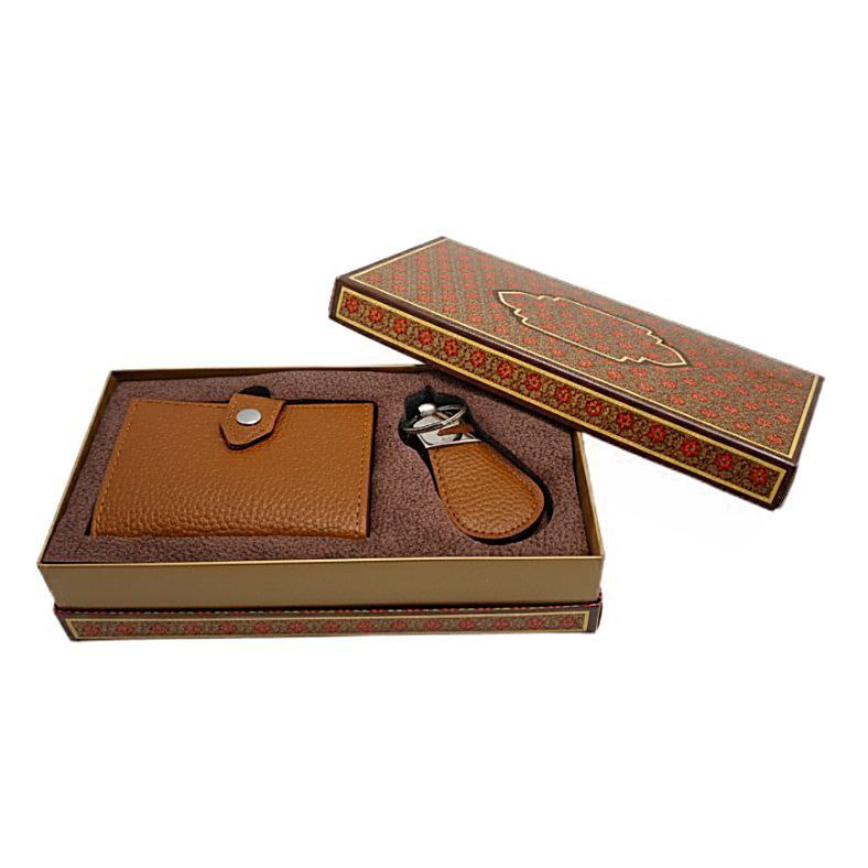 ست جاکارتی دوقلو بندی و جاکلیدی جعبه طرح خاتم چرم طبیعی گاو